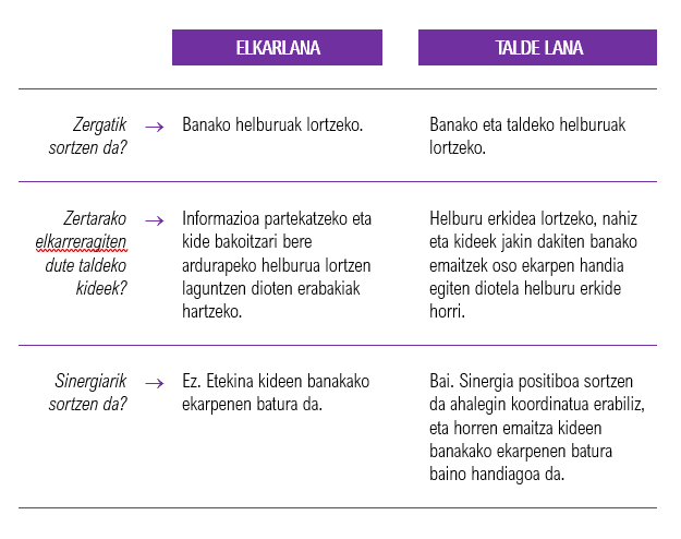 Profesionalekiko komunikazioa zaintzeaz eta indartzeaz gain, ezinbestekoa da erakundeak profesionalen arteko komunikazio ona susta dezan, eta, horretarako, talde lana bultza dezan. Talde lanaren eta elkarlanaren ezaugarriak alderatuz gero, hobeto ohartuko gara talde lanaren ezaugarriez:
