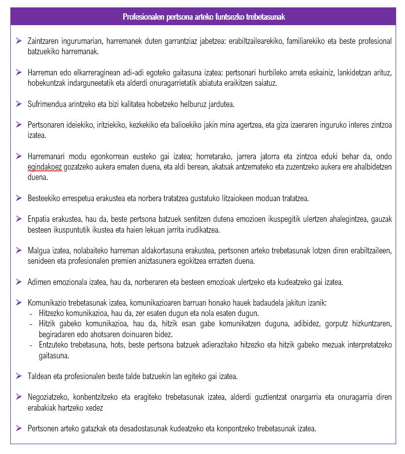 Harreman jardunaren eraginkortasunak eta giza izaeraren nahiz bertan parte hartzen duten pertsonen bakantasunaren aintzatespenean oinarritutako arreta inguruabar atsegina eraikitzen laguntzeko benetako aukerak beharrezkoa du profesionalek pertsona arteko trebetasun batzuk izna ditzaten, emandako arretaren kalitatean eta asistentzia giroan eragina izan dezaketenak. Arlo horretako trebetasun nagusiak honako hauek dira: