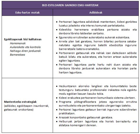 Garrantzitsua da kontuan hartzea bizi estiloaren gaineko esku-hartzeak gainerako esku-hartze modalitateak baino sistematizazio gutxiagokoak direla. Beharrezkoa da taldeko kide guztiek estrategiak pentsatzea, horiek taldeko jarduerak aztertzen eta proposatzen diren bileretan partekatzea eta bilera horietan eztabaidatu eta onartu diren estrategia guztiak aintzat hartzea esku-hartzeak garatzen direnean, bai laneko testuinguruan, bai etxean edo komunitatearen bestelako inguruneetan. Beharrezkoa da estrategia horiek eguneroko errutinen ebaluazioan, eskura dauden baliabideetan, ezinduaren zaletasunetan eta familiaren lehentasunetan oinarriturikoak izatea.