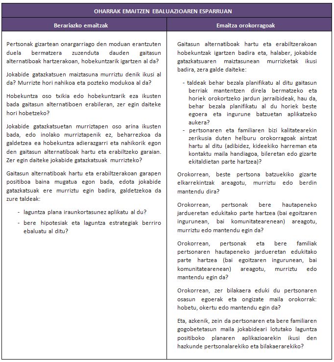 - Laguntza plana eraginkorra denean, hazkundeak lortuko dira gaitasunetan, murrizketak jokabide gatazkatsuetan eta hobekuntzak bizi estiloan. Horretarako, taldeak nola jarraitu galdetu behar dio bere buruari: lortutako emaitzak mantentzea bakarrik komeni den edo plana zabaltzea komeni den hobekuntza berriak lortze aldera.