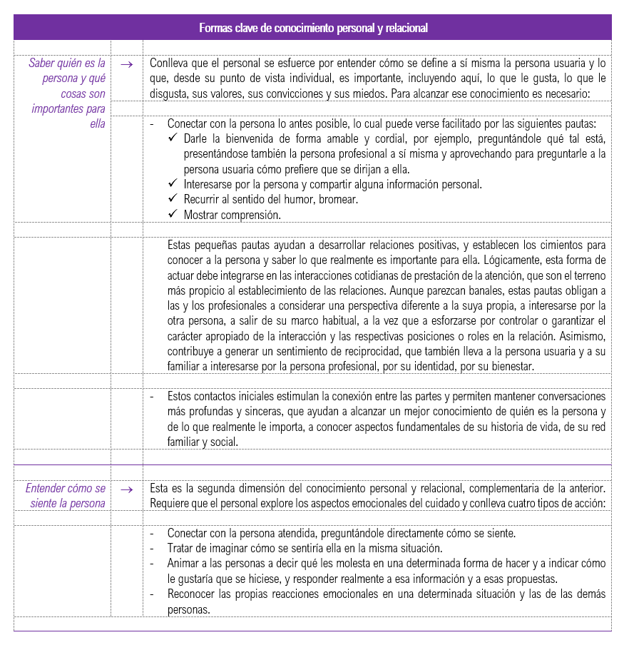 En este sentido, puede decirse que, según la literatura especializada, existen dos formas clave de conocimiento personal y relacional que capacitan al personal, a las personas usuarias y a sus familiares para cooperar con el fin de modelar la forma en que se hacen las cosas: la primera consiste en saber quién es la persona usuaria y qué cosas son importantes para ella; la segunda consiste en saber y comprender cómo se siente esa persona. Estos dos tipos de conocimiento se detallan a continuación.