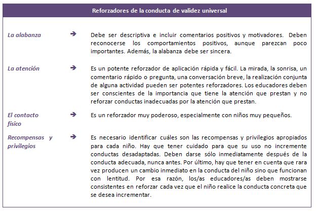 Los reforzadores no son universales ni automáticos, es necesario buscar aquéllos que son significativos para cada alumno. Para ello, es fundamental identificar qué reforzadores son los más valorados por el alumno, si bien, con carácter general, se pueden utilizar: