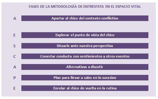 - Las fases de la intervención en el espacio vital combinan muy diferentes técnicas: la contención inicial, la escucha activa, la empatía, y las técnicas de solución de problemas. Con ello se persigue que la intervención educativa tenga un repercusión de mayor calado y con posibilidades de afectar a los aprendizajes a medio y largo plazo. (…).