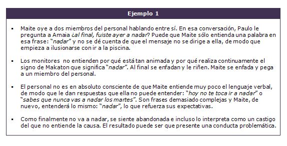 - Si cometemos el error de creer que una persona entiende el lenguaje verbal cuando no es así, nuestras expectativas serán demasiado elevadas, de modo que si responden de forma inadecuada o no responden, pensaremos, erróneamente, que lo hacen por desobediencia, por obstinación, por vagancia, etc., cuando en realidad el único problema es que, en esa ocasión, no hemos acompañado nuestra frase de gestos u otros indicios no verbales. Si no nos es posible determinar con precisión qué nivel de comprensión tiene realmente una persona, es bueno acompañar las frases con gestos, imágenes, señales o símbolos, porque pueden ayudarle a entender. Si no los necesita, simplemente hará caso omiso.
