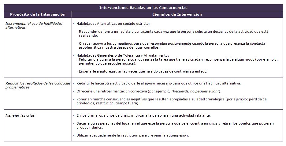 Aunque se integran en los planes de Apoyo Conductual Positivo, las intervenciones basadas en las consecuencias –es decir, en lo que las  personas que se encuentran en su entorno hacen tras la ocurrencia de la conducta problemática–, no constituyen su componente más importante y sólo resultan realmente eficaces cuando se aplican junto con otros componentes del plan, en particular con la enseñanza de habilidades alternativas.