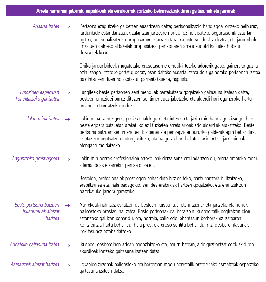 Elkarrizketa horiek garatzean, profesionalek hainbat gaitasun edo jarrera izan behar dituzte, eta horiek ikas daitezke eta ikasi egin behar dira. Funtsean, honako hauek dira: