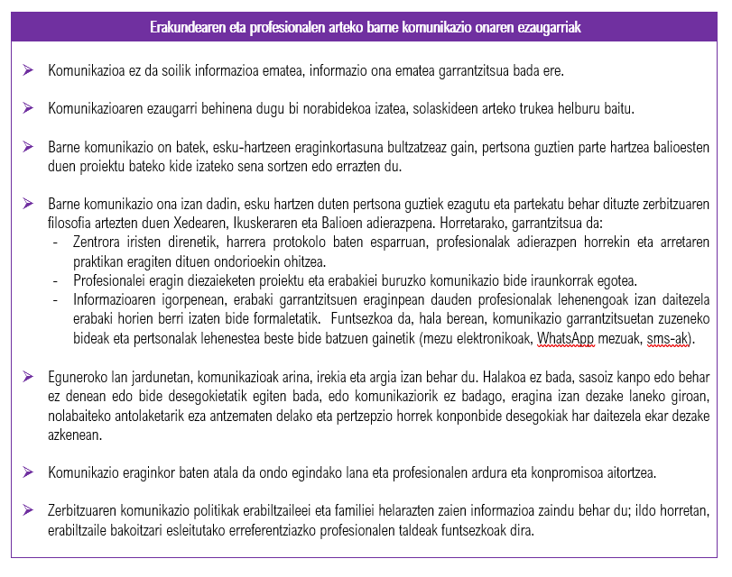 Ikuspegi horretatik, erakundeek, bai zerbitzua lotuta dagoen erakunde edo antolakundeak, bai zerbitzuaren beraren zuzendaritzak, harremanen dinamikan parte hartu behar dute eta dinamika horrekin engaiatu behar dute, ahalegin horretan funtsezkoa baita barruko mailan bultzatzen duten komunikazio moldea. Horren haritik, komeni da erakunde batek bultzatutako komunikazioak zer-nolako alderdiak izan behar dituen aintzat hartzea (horietako batzuk 7. atalean jorratuko dira, lidergo eraginkor eta parte hartzailez jardutean), bai profesionalekin, bai erabiltzaileekin, bai senideekin: