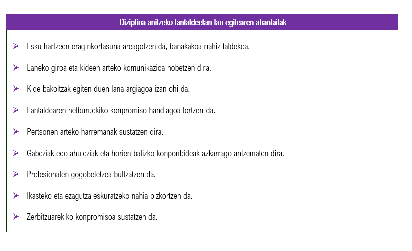 Harremanetan Oinarritutako Arretaren esparruan, komeni da taldea diziplinartekoa izatea, ez diziplina anitzekoa bakarrik, adostutako helburu erkideak lortzeko lan partekatua berma dadin. Lan egiteko modu horrek hainbat abantaila ditu zerbitzuentzat: