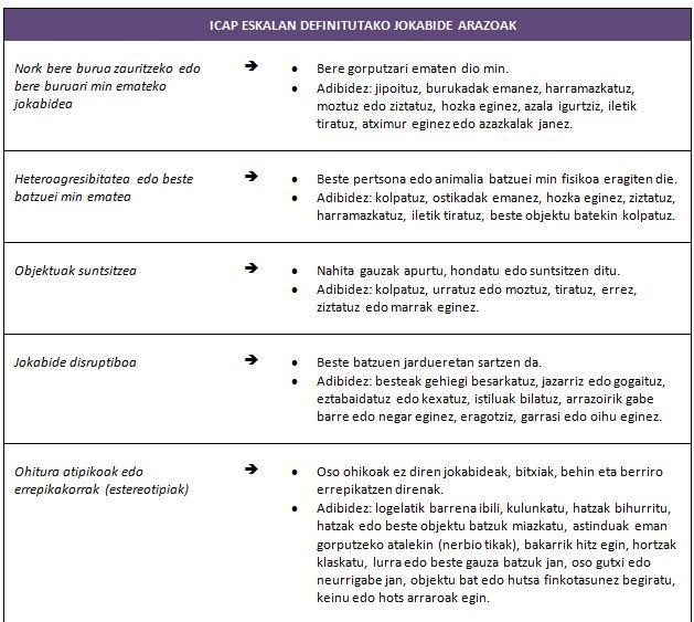 Horien identifikazioa errazte aldera, ICAP eskalaren barruan dagoen jokabideari lotutako arazoen sailkapena jaso da, hurrengo dokumentutik: MONTERO CENTENO, D. (1993). “Evaluación de la Conducta adaptativa en personas con discapacidades. Adaptación y validación del ICAP”. Hezkuntzako Ikerkuntza eta Ebaluazio Saila. Deustuko Unibertsitatearen ICE, Bilbo.