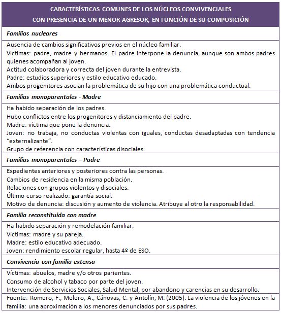 En un estudio realizado por Romero y cols. (2005) se halló que el 56% de los jóvenes denunciados por conductas violentas hacia sus padres, vivía en organizaciones familiares diferentes al núcleo familiar originario. A través de análisis multivariados, encontraron asociaciones que permiten establecer características comunes en cada núcleo convivencial: