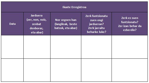 - Ikaste erregistro bat erabili. Egunero informazioa erregistratzeko modu bat da; bertan, jarduera bakoitzaren deskripzioari erantsi egiten zaizkio hura garatu zen testuinguruari buruzko datuak eta jarduera garatzeko moduari buruzkoak. Positiboak izandako alderdiak definitzeko saiakera egingo da, eta baita positibo izan ez zirenak eta, beraz, etorkizunean aldarazi beharko direnak definitzekoa ere. Hurrengo datuak jasotzen dituen taula bat osatu daiteke:
