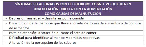 En la siguiente tabla se enumeran los síntomas relacionados con el deterioro cognitivo que tienen una relación directa con la alimentación y son causas de malnutrición.